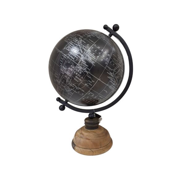 Com dimensões impressionantes de 38 x 25 cm, este globo é mais do que uma peça decorativa; é uma representação estilizada do nosso mundo. A tonalidade preta confere uma sensação de modernidade e mistério, tornando-o uma adição versátil a qualquer ambiente.